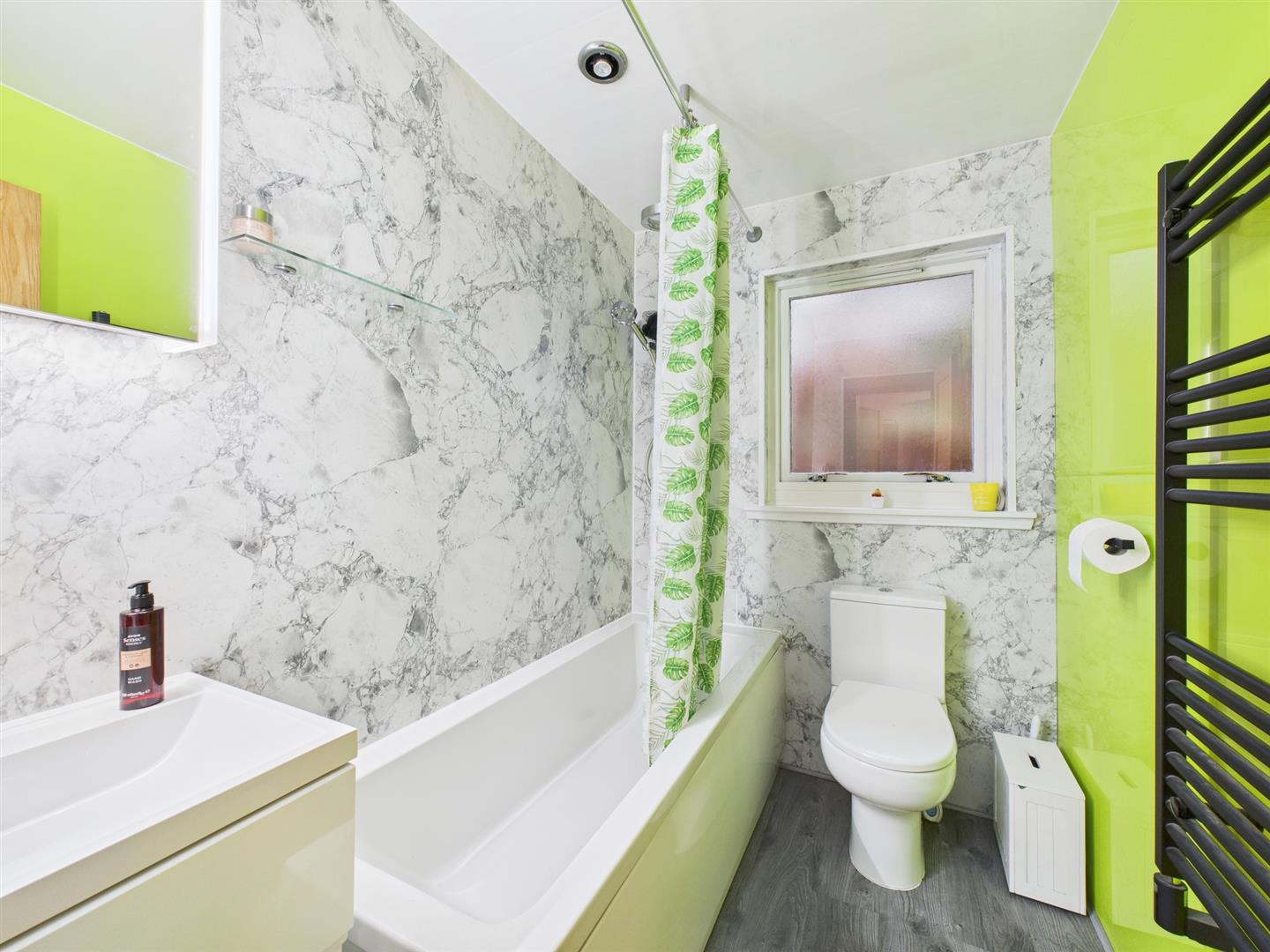 This modern and stylish bathroom includes wc, wash hand basin and bath with shower over.