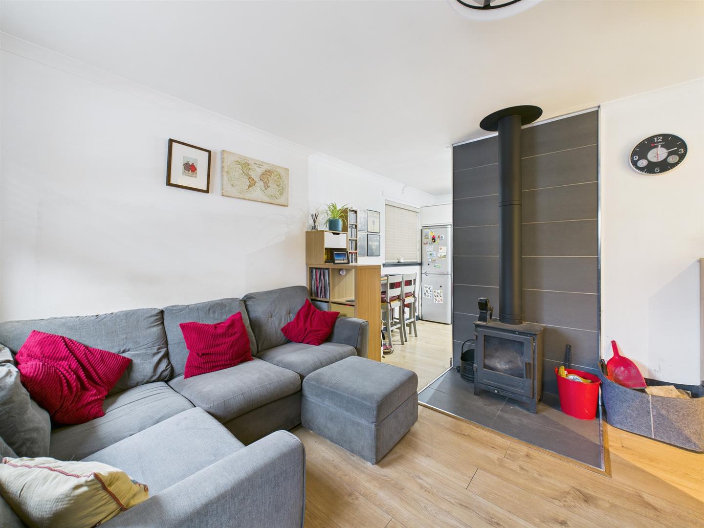 The bright and welcoming lounge has a window to front and opens to the kitchen. It has an attractive woodburner as it's focal point. Space for dining.