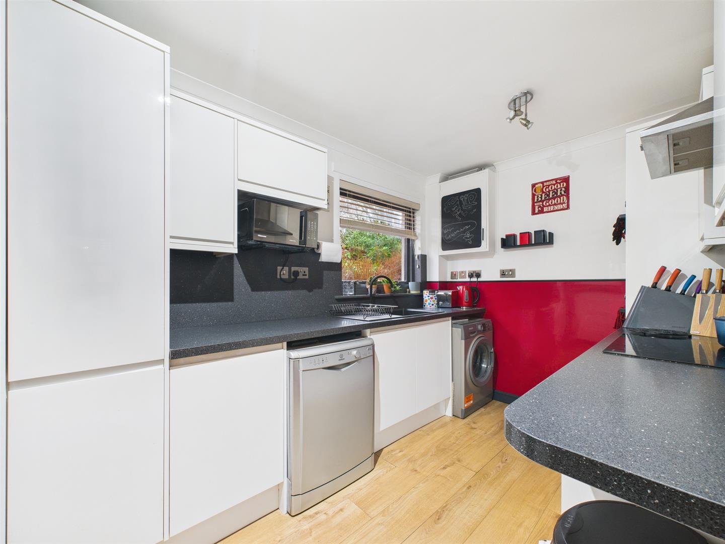 The well appointed kitchen has a good selection of wall and base units with window to rear. Space for dining.