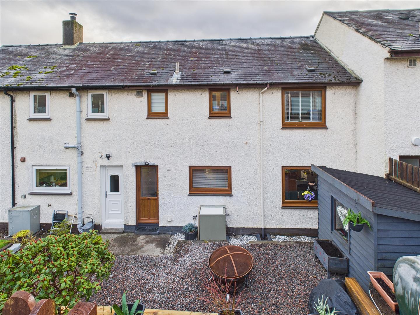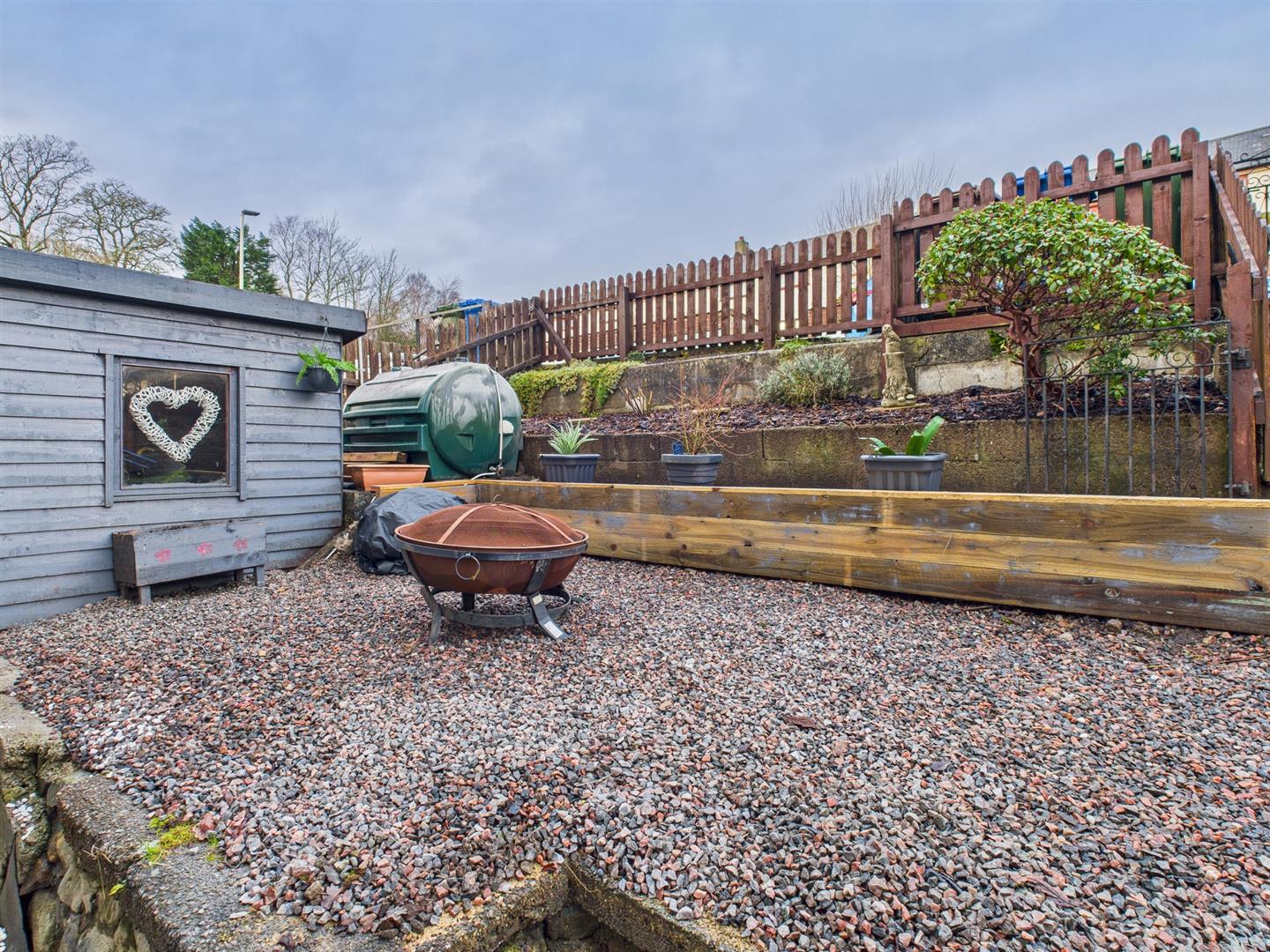 The stepped rear garden is a mix of stone chippings and bark and includes a timber shed.