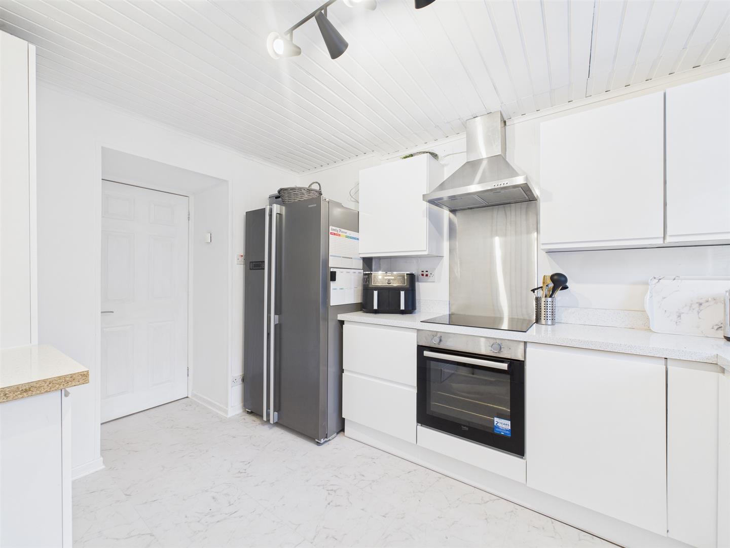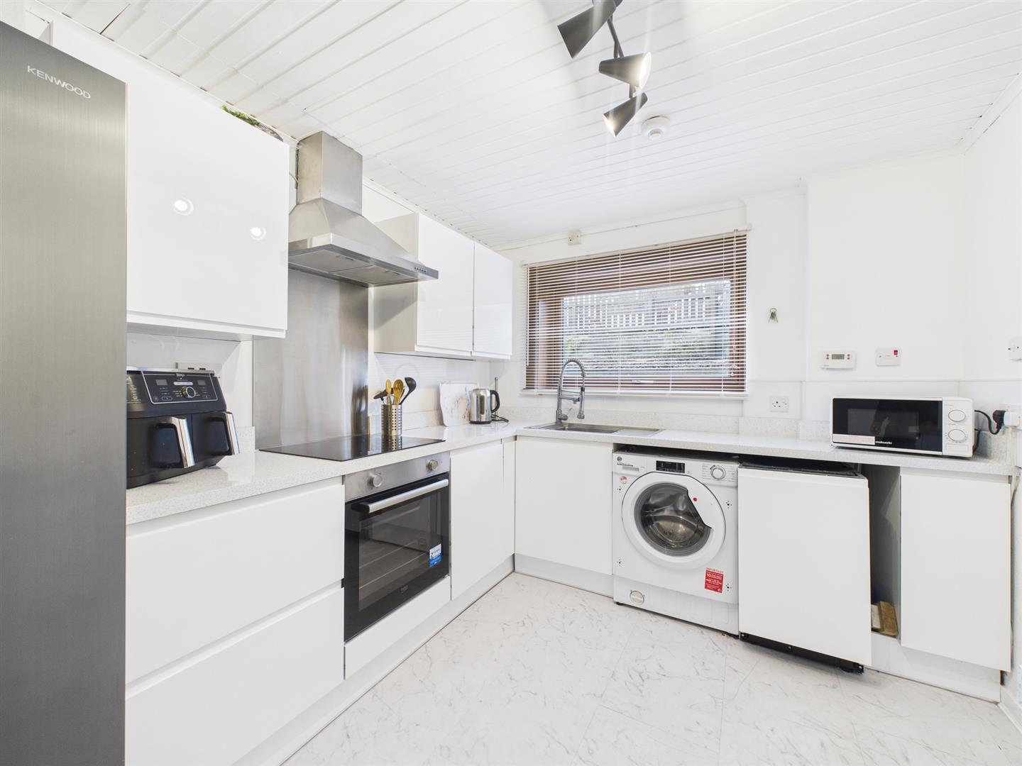 The well appointed kitchen has a good selection of wall and base units with contrasting worktops, integral induction hob and oven. Door to rear porch. Window to rear.