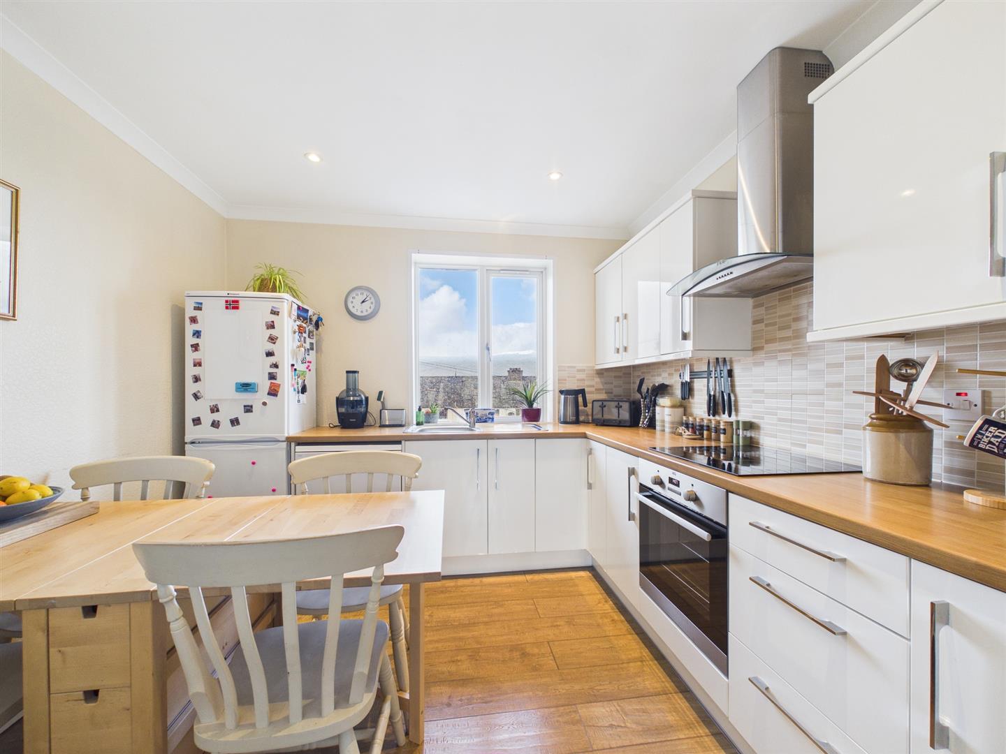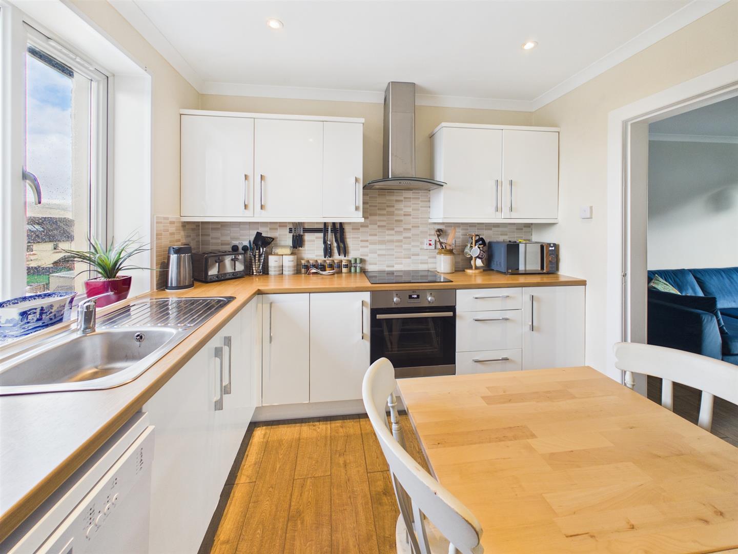 Modern kitchen with ample wall and base units and contrasting worktops. Space for formal dining and window to rear.