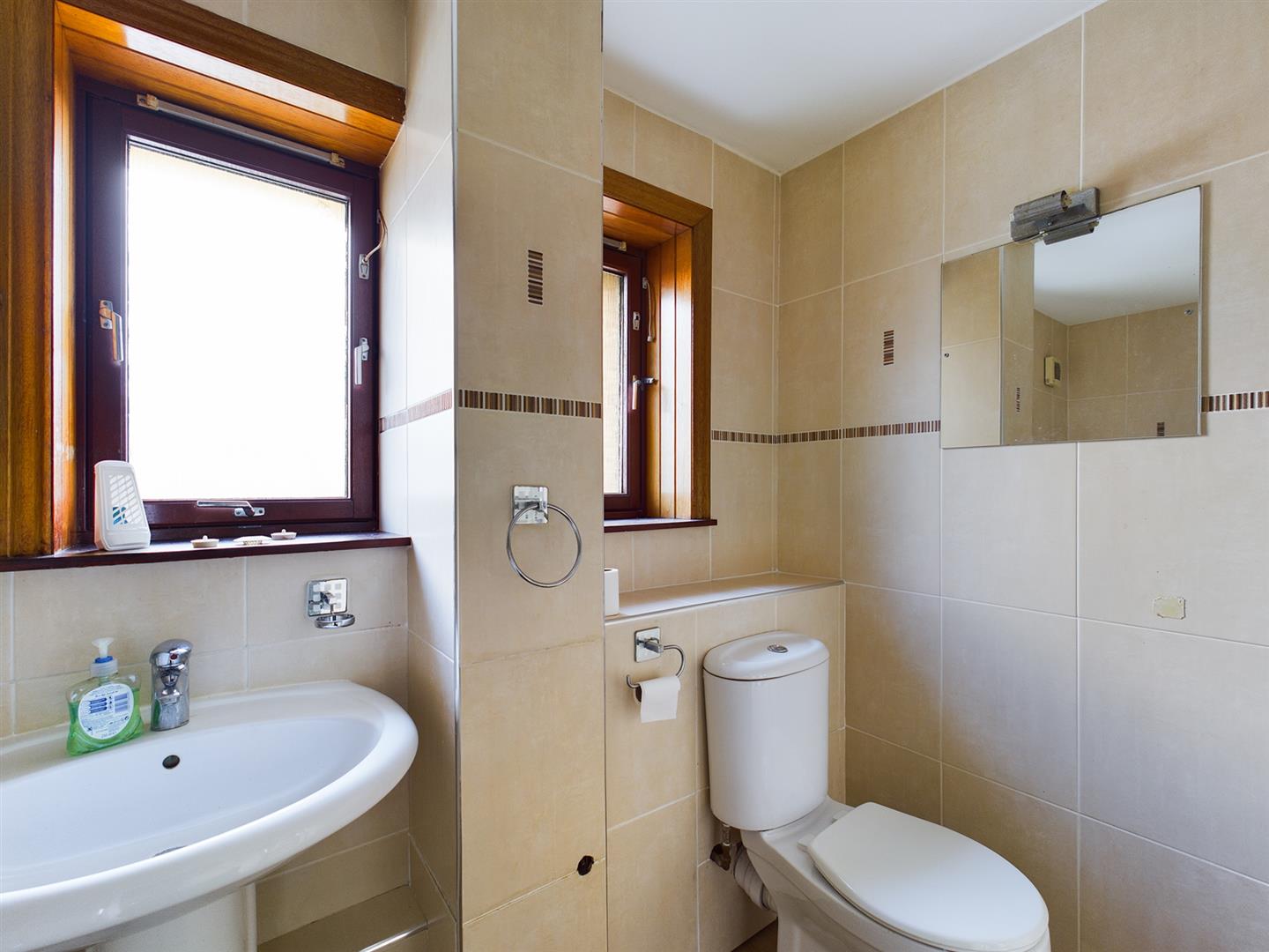 Family bathroom with shower over bath, wash hand basin and WC.