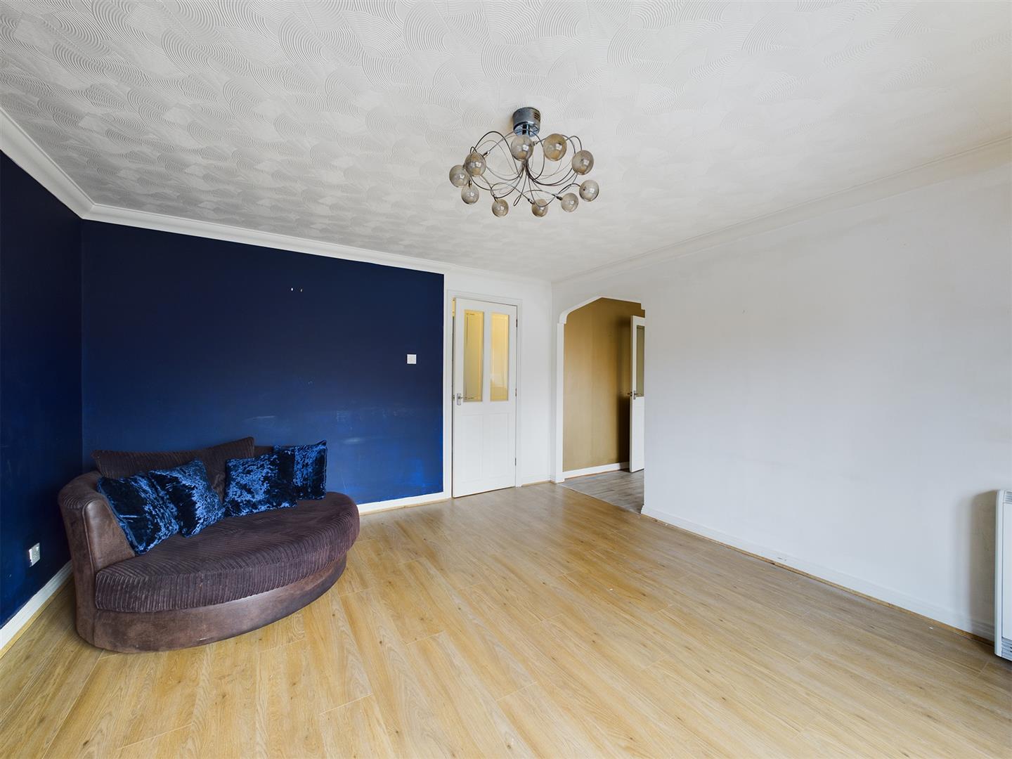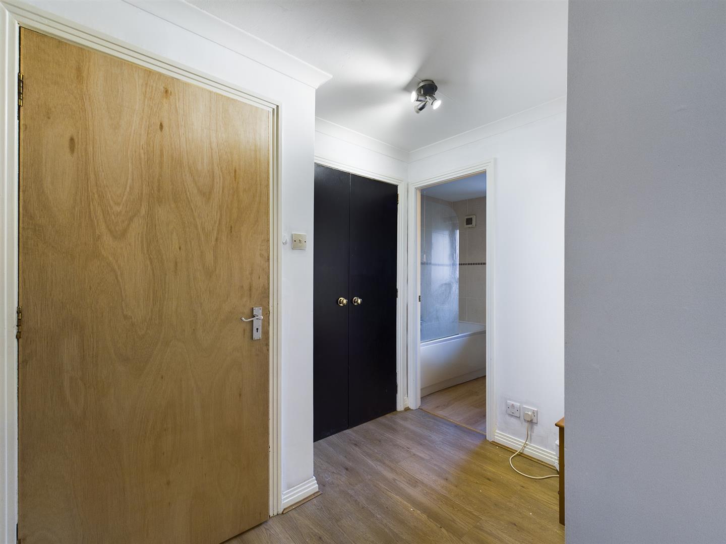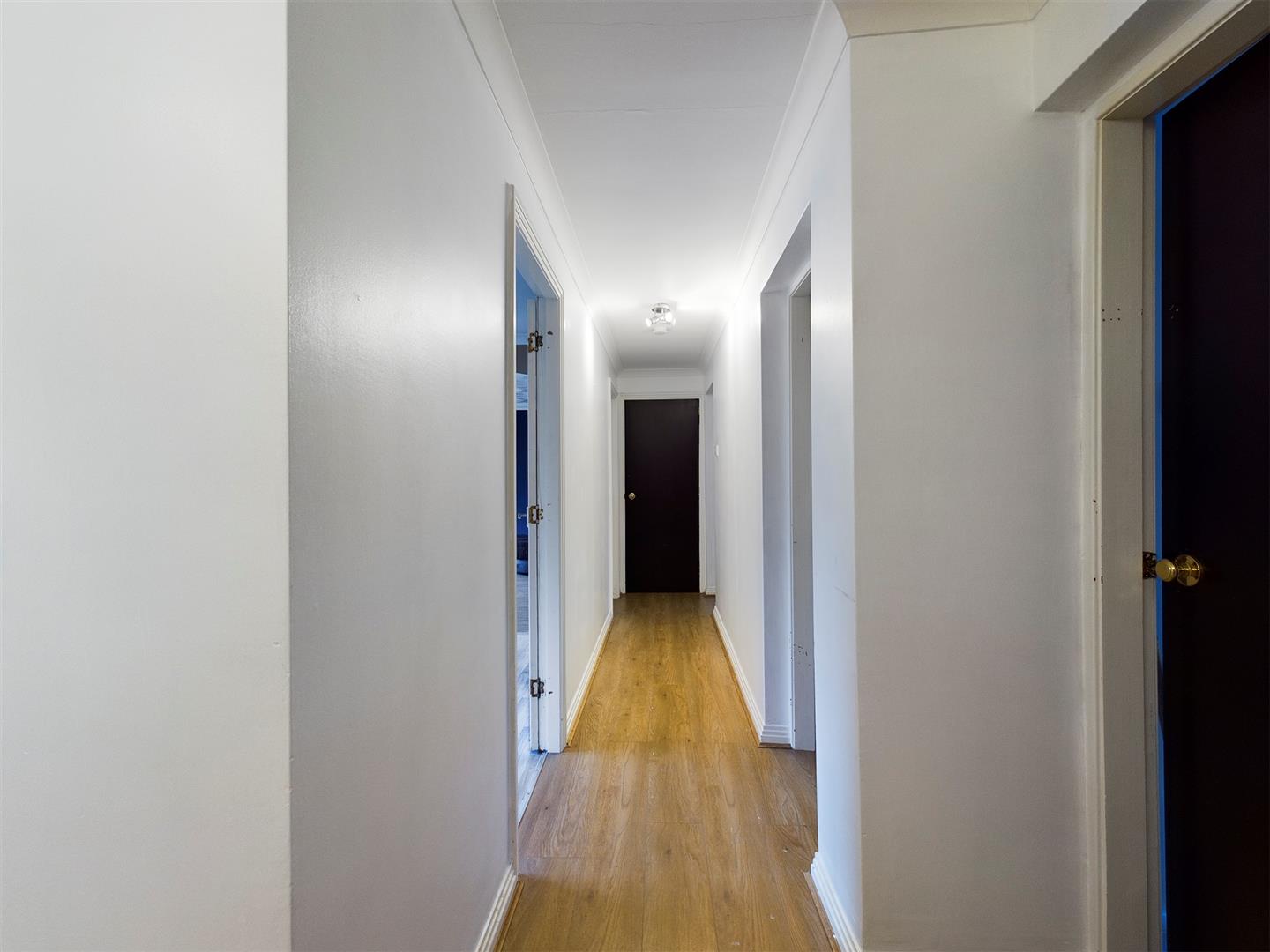 Spacious hallway with neutral decor, laminate flooring and access to all rooms within the property.