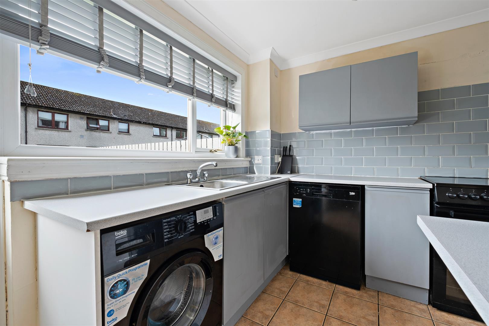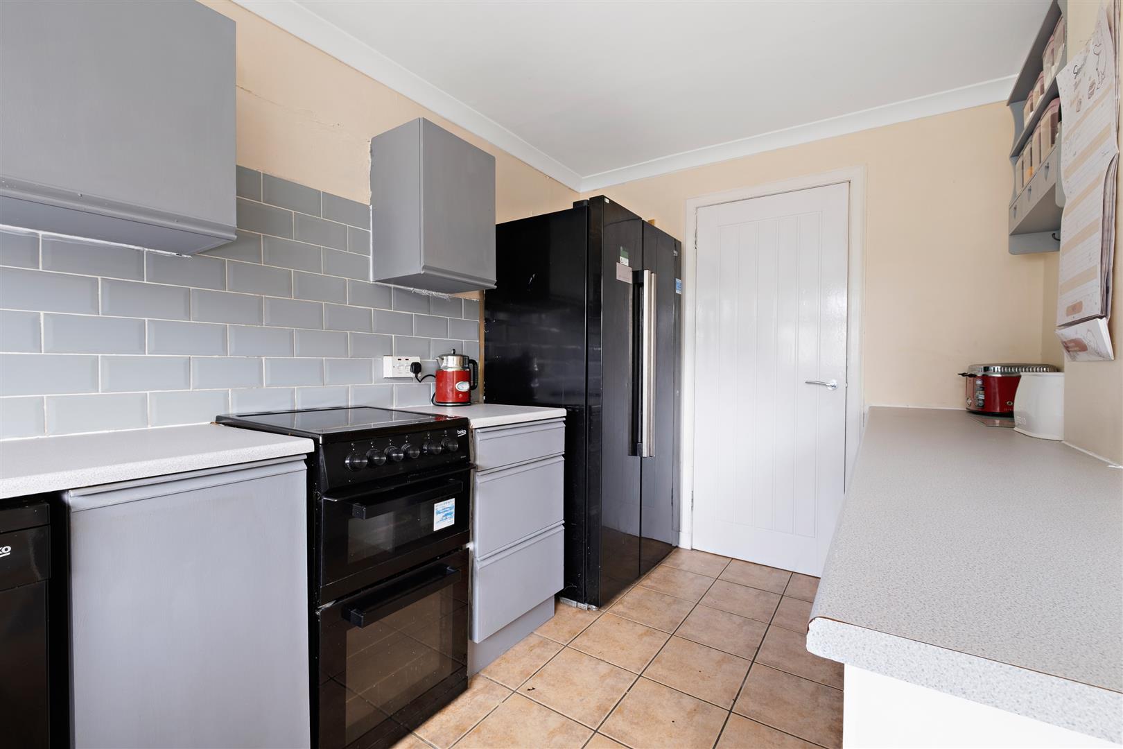 The well appointed kitchen has a good selection of wall and base units with contrasting worktops. Door and window to rear.