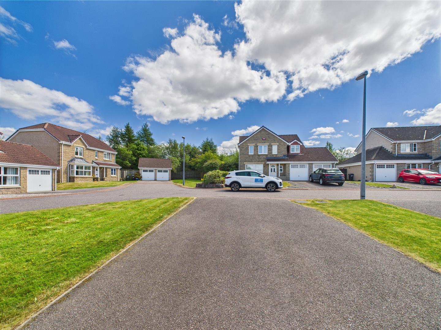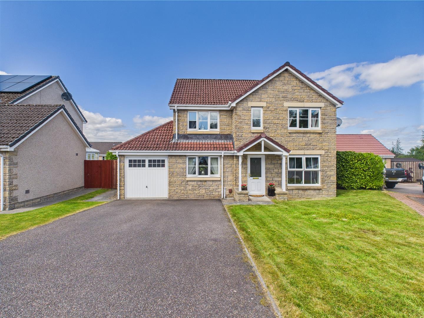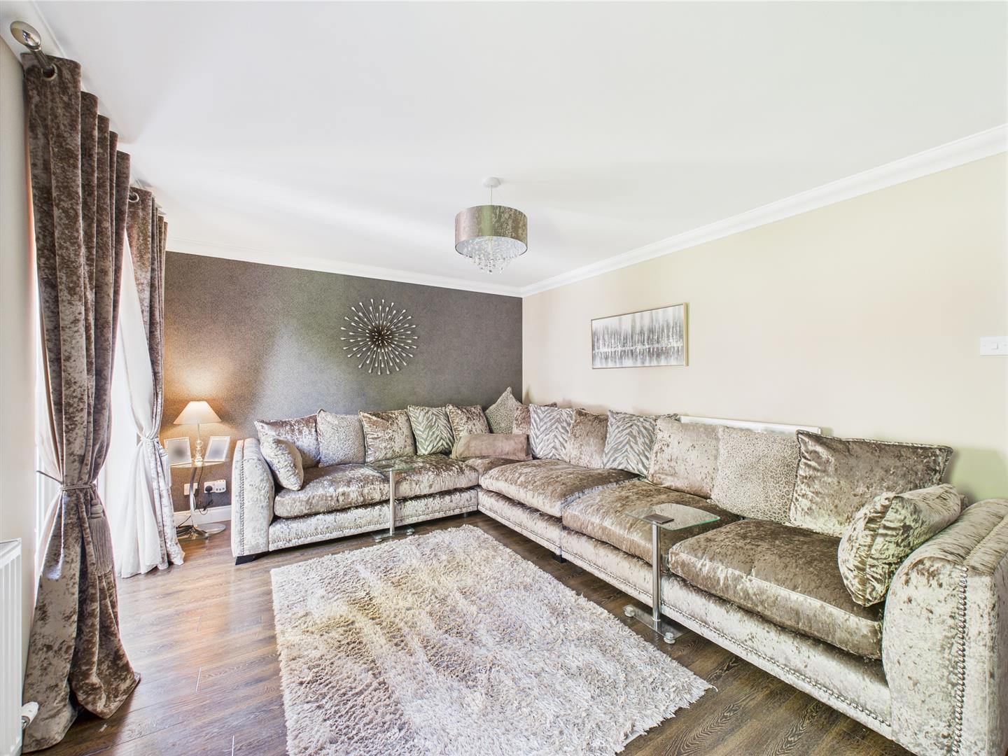 The front garden is laid to lawn. The large driveway provides off street parking and leads to attached garage.