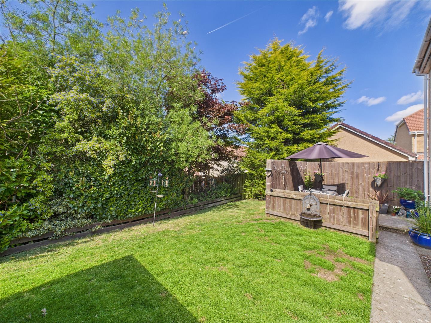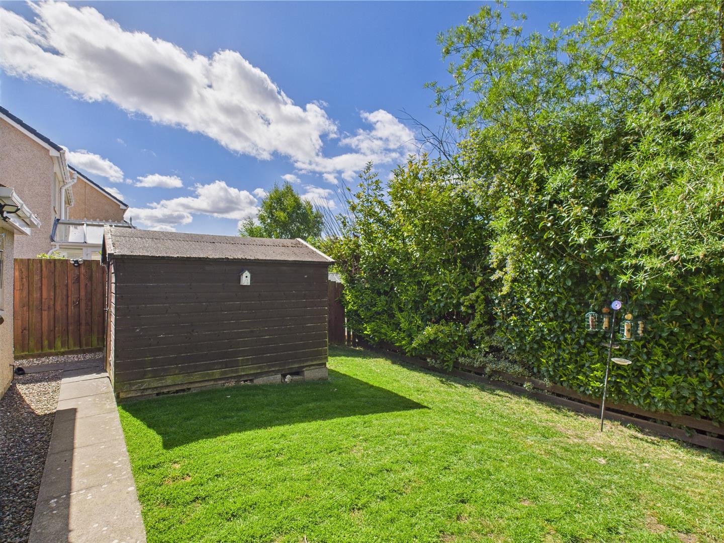 The private rear garden is laid to lawn with an area of decking, providing a place to relax, and a large garden shed.