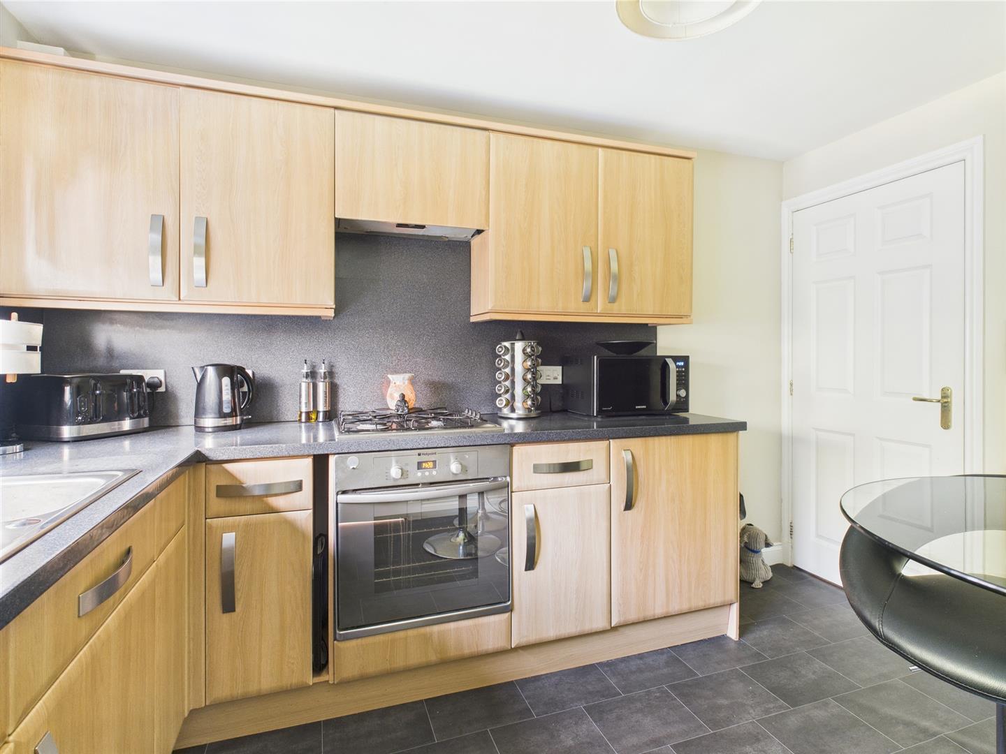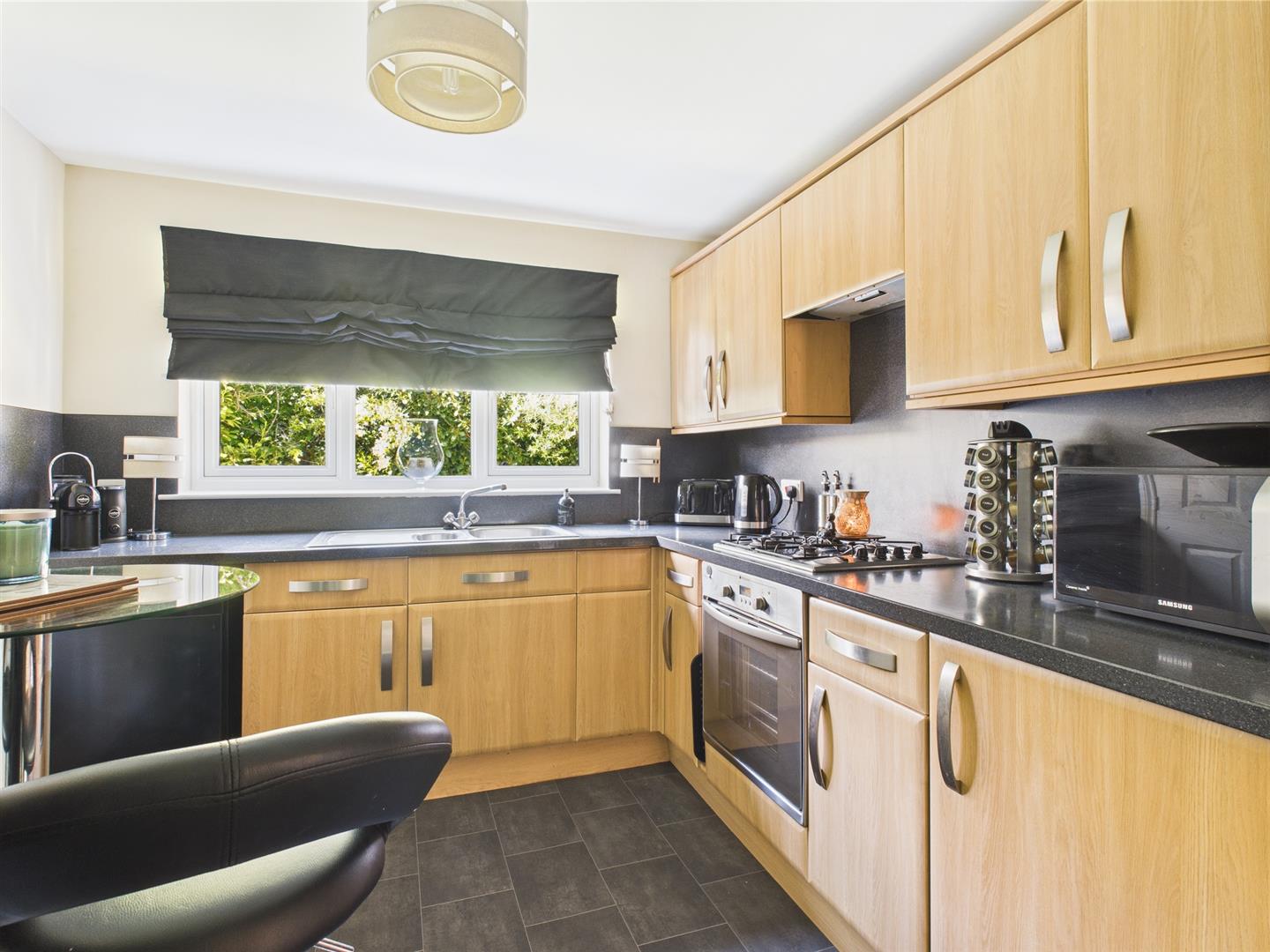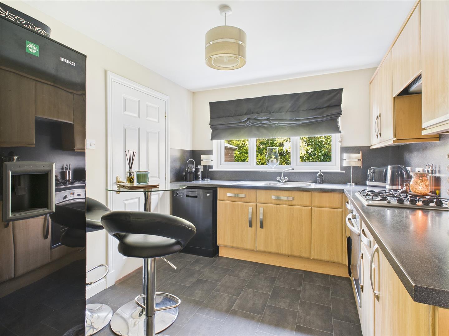 The modern and stylish kitchen has a good selection of wall and base units with contrasting worktops. Space for informal dining. Window to rear and door to utility room.