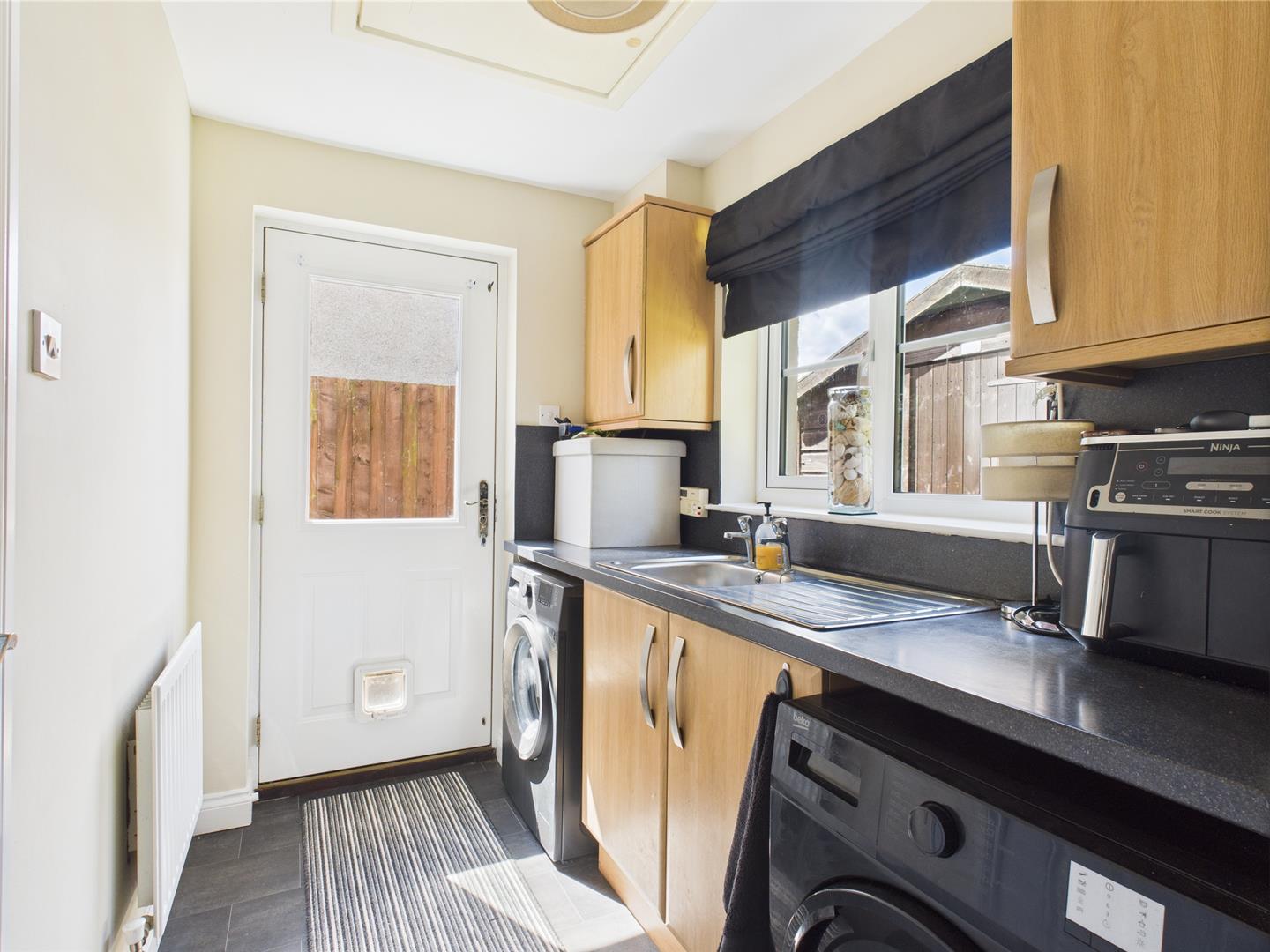 Accessed from the kitchen the utility room has some wall and base units, worktop and sink and drainer. Window to rear. Door to garage and side elevation.