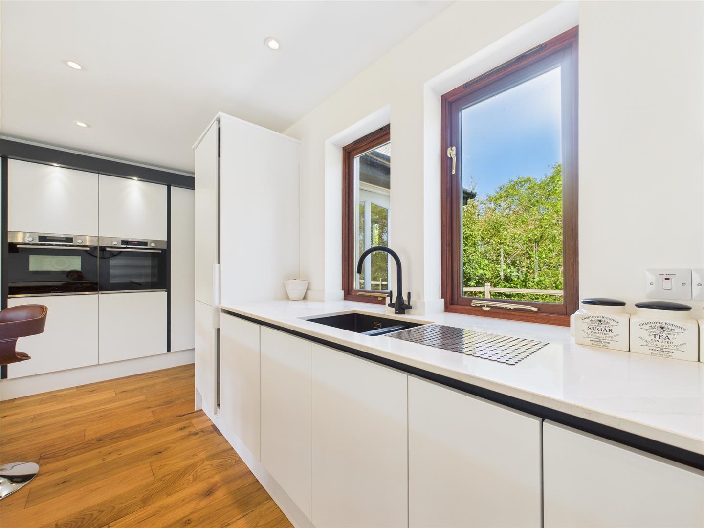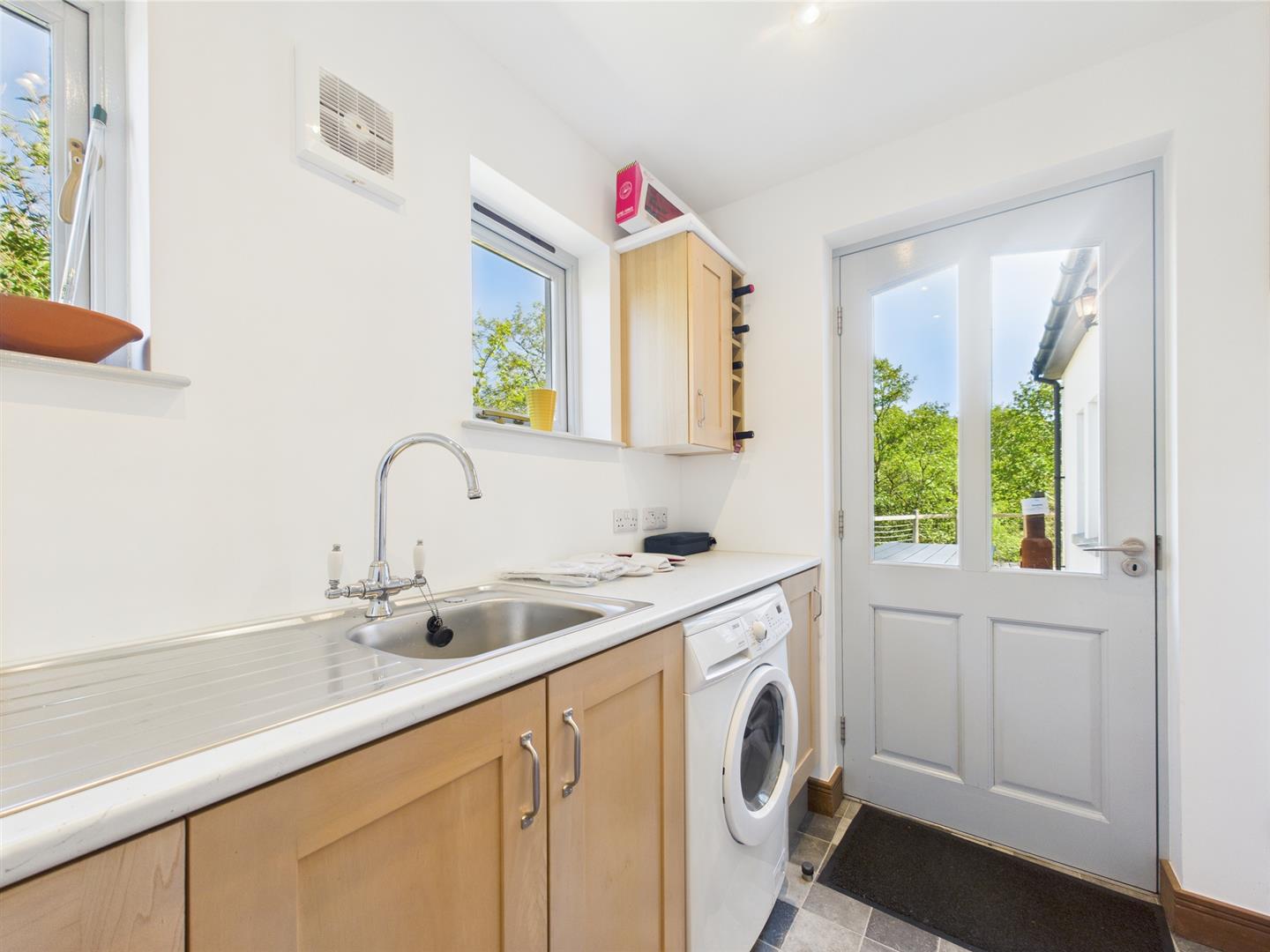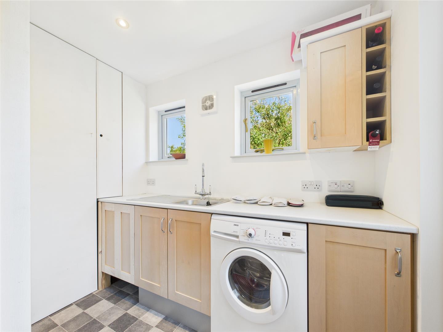 Cleverly designed for practicality, this light-filled utility room includes a washing machine, modern sink unit, and ample countertop space with multiple storage options. Two windows and a glazed door bring in natural light, while wall-mounted cabinetry includes built-in wine storage—adding a thoughtful touch to this functional space. Neatly tucked off the kitchen, it keeps daily tasks convenient yet discreetly out of sight