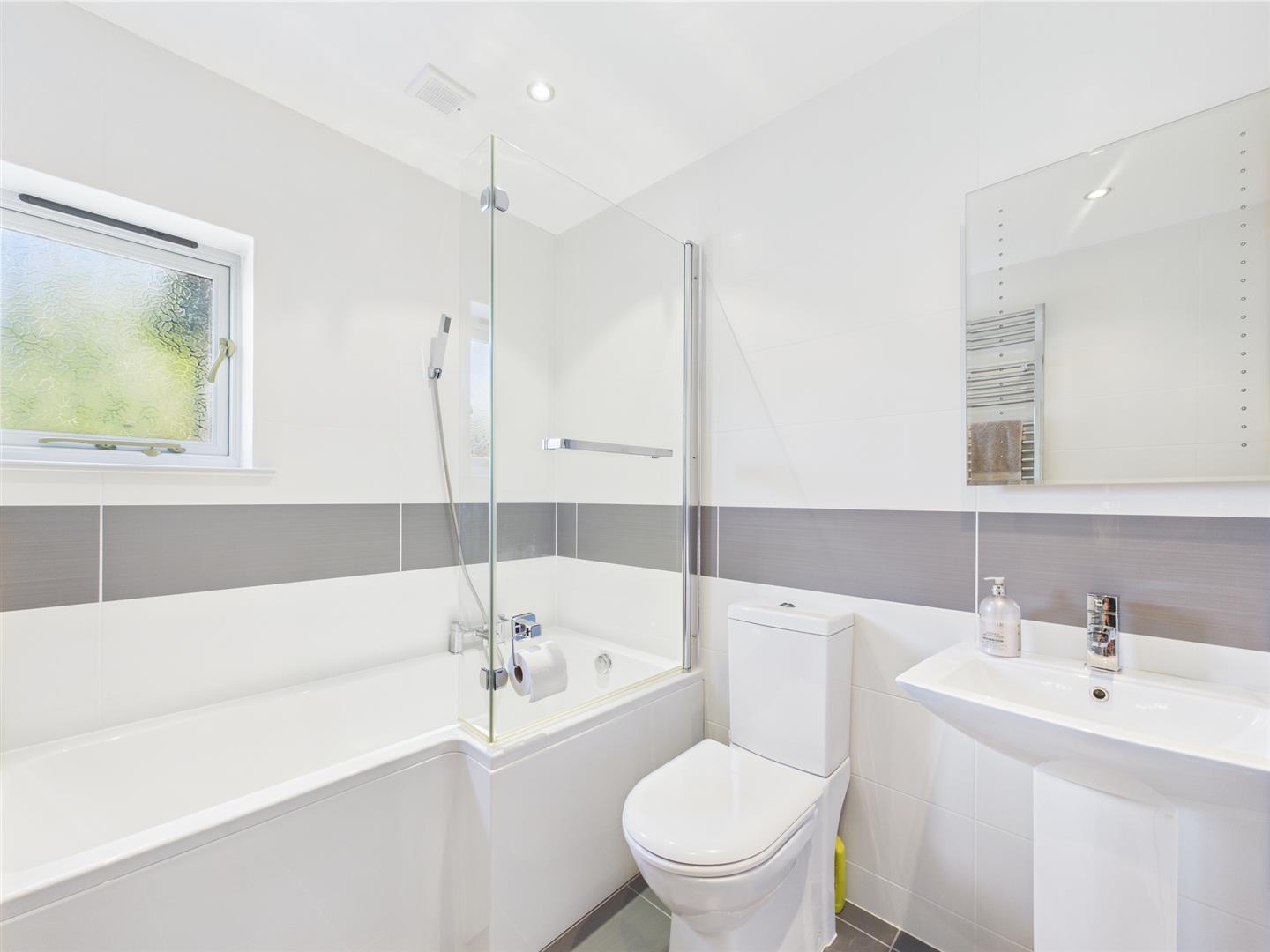 This well-placed bathroom features a full-size bath with overhead shower, a glass screen, and sleek neutral finishes. A frosted window brings in light while maintaining privacy. Easily accessed from the hallway, it adds comfort and convenience to the ground floor