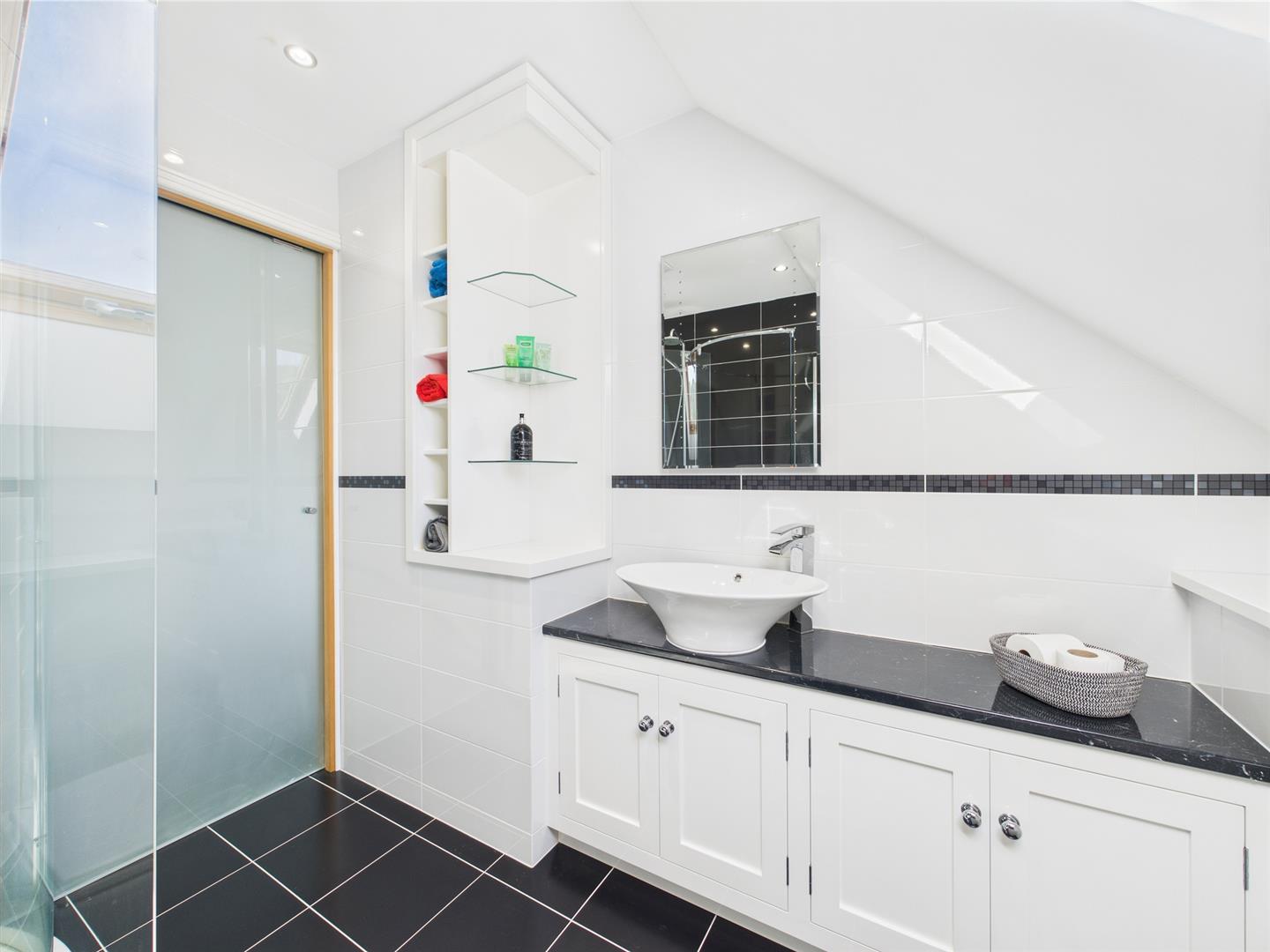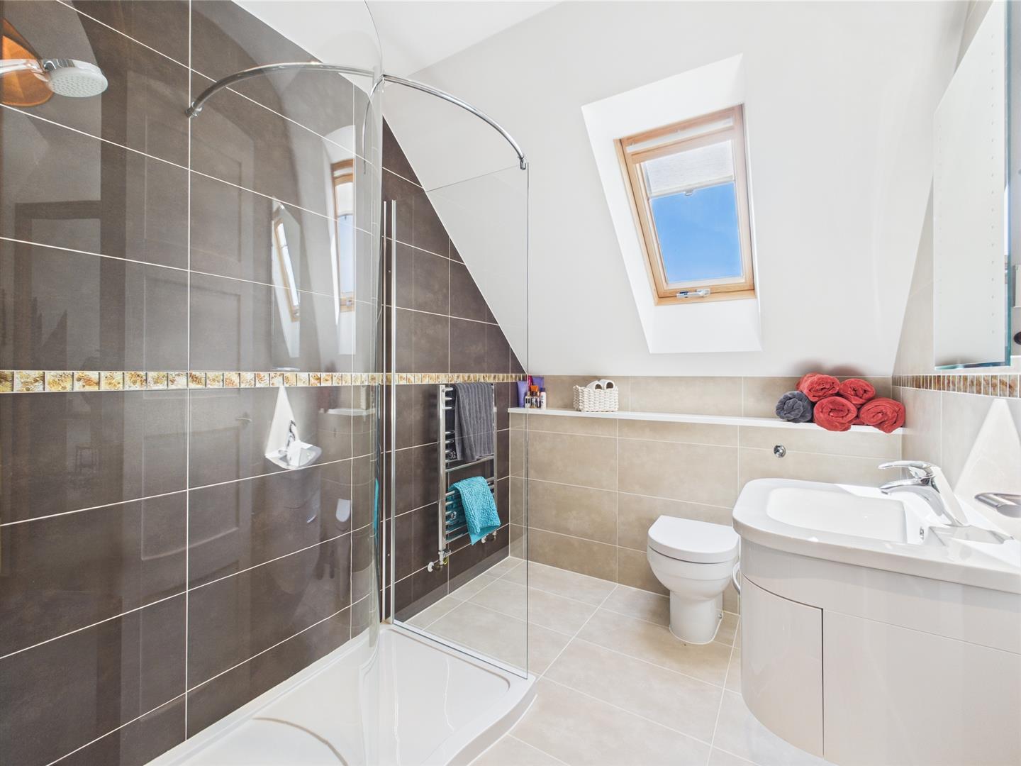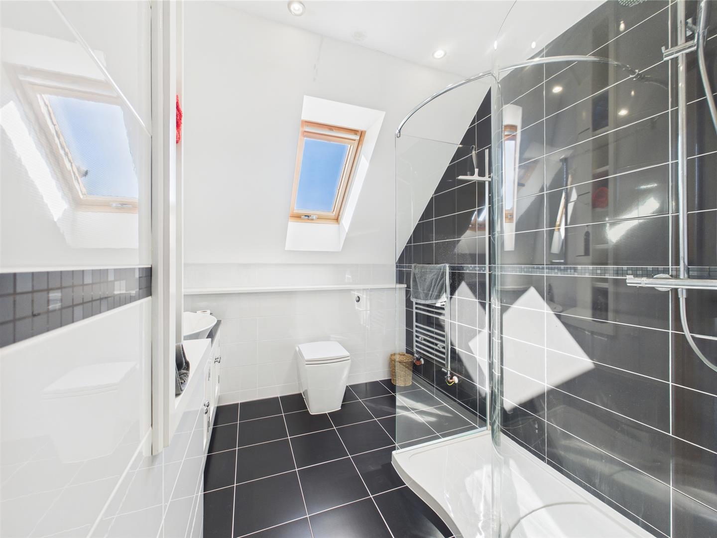 Bright and stylish, this upstairs shower room features a curved glass enclosure, striking monochrome tiling, and a sleek vanity unit. Twin skylights fill the space with natural light, while thoughtful fittings like a towel rail and under-sink storage add everyday ease.