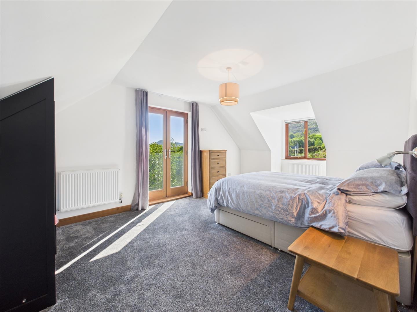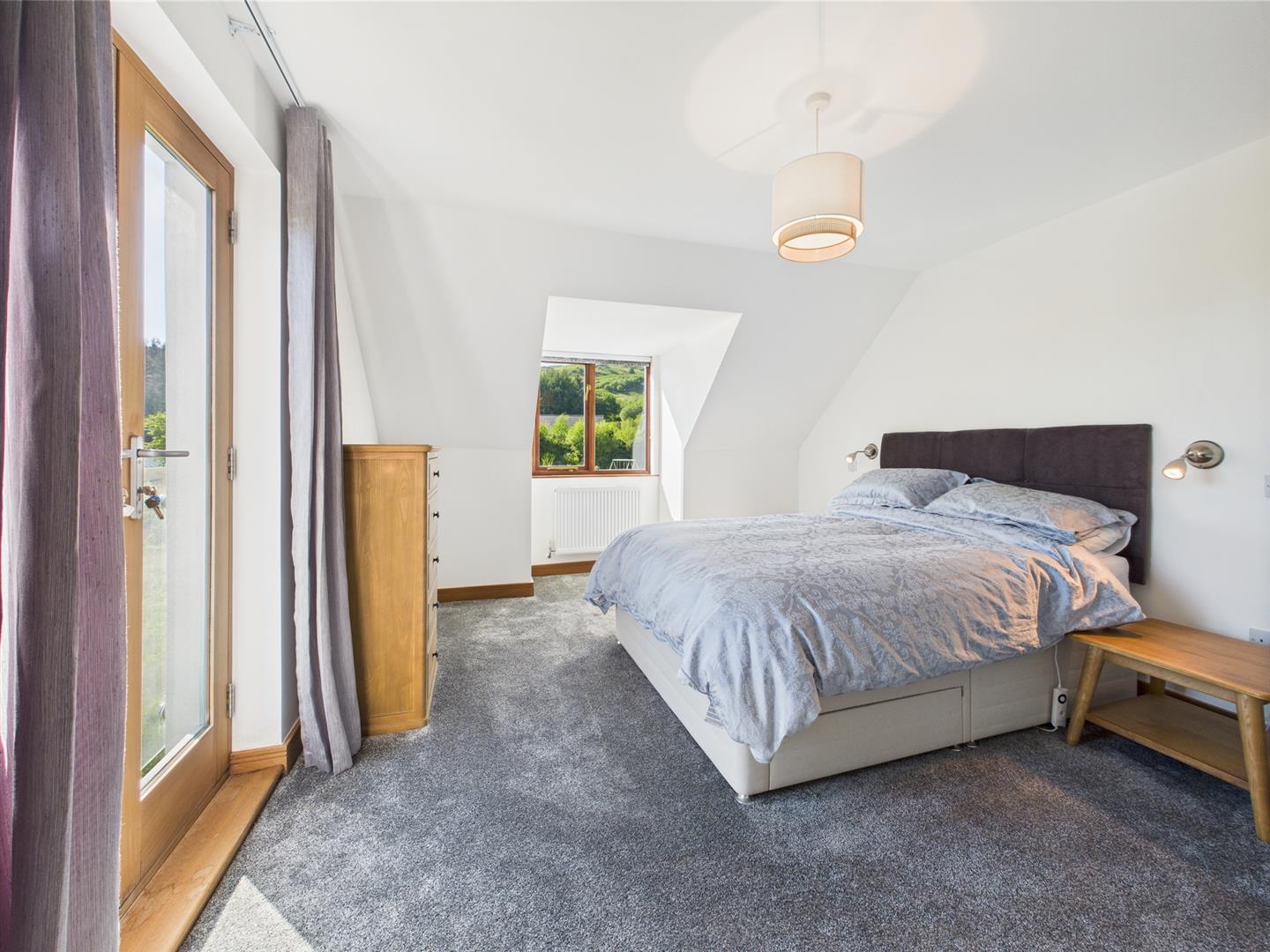 Positioned to the front of the house, this bright double bedroom enjoys excellent natural light from French doors opening onto a small balcony. A second window adds cross-light and leafy views, while sloped ceilings and neutral décor create a cosy yet airy atmosphere. With ample space for a large bed and freestanding storage, it serves beautifully as a principal or guest bedroom.
