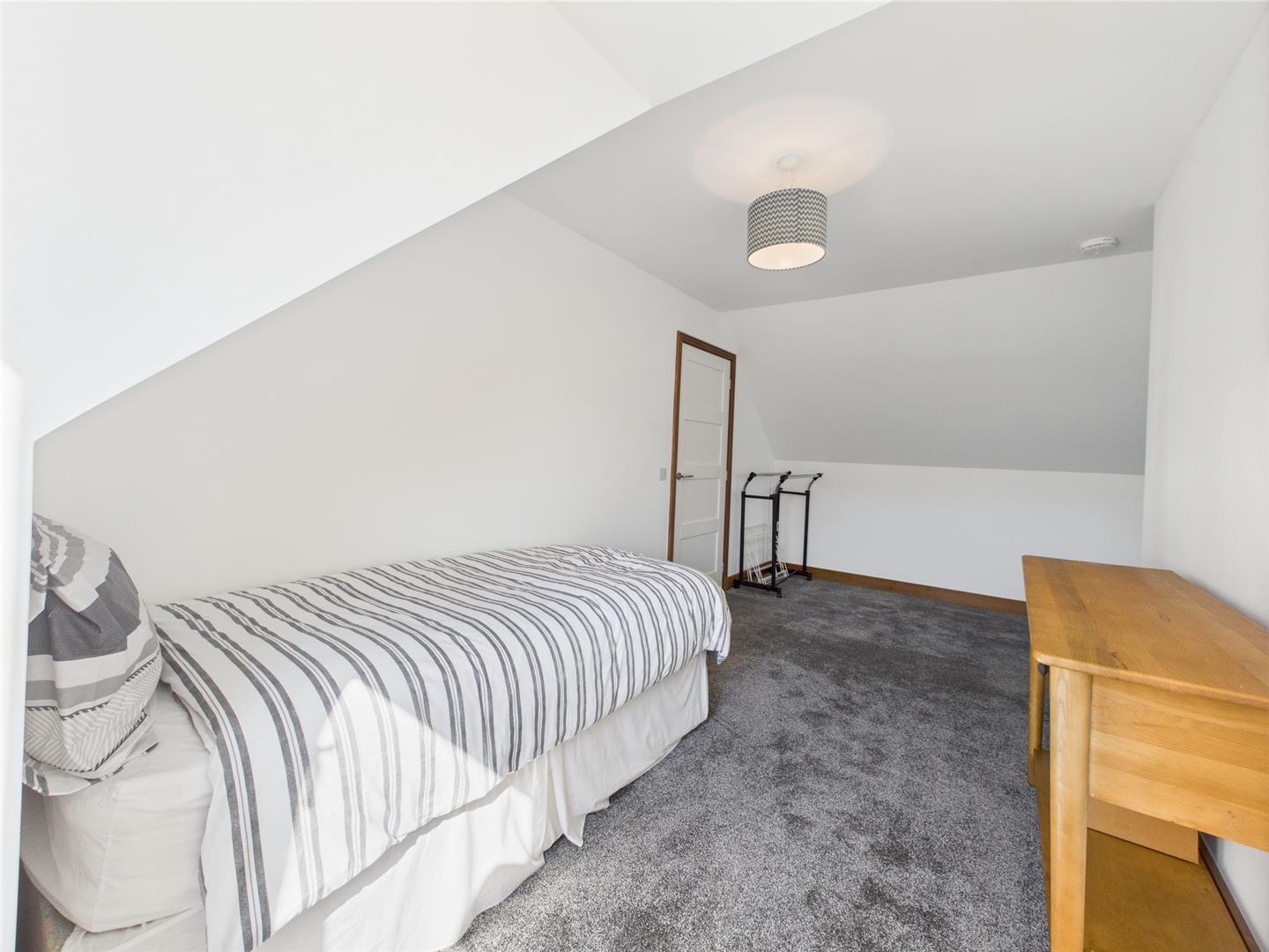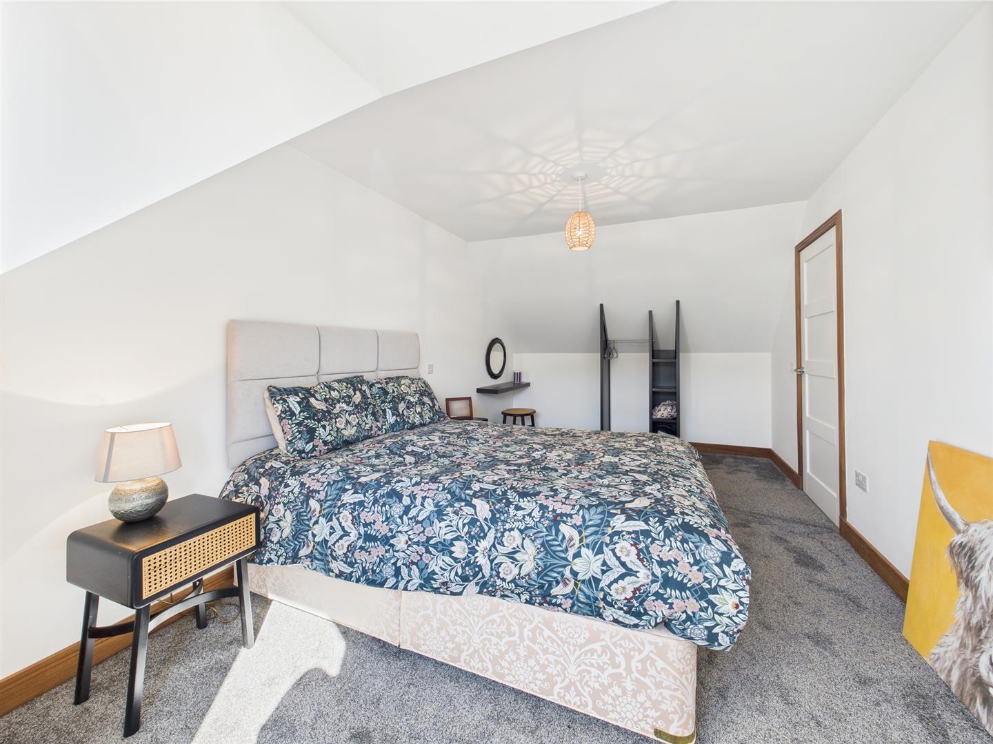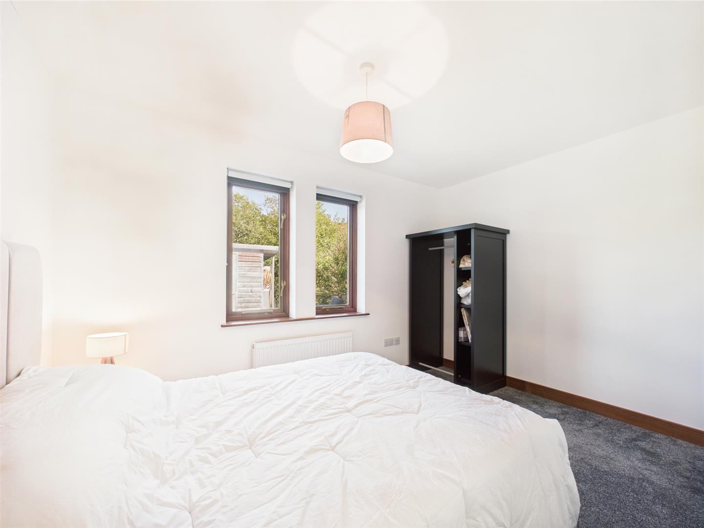 Situated on the upper level, this well-proportioned bedroom enjoys garden outlooks and excellent natural light. With comfortable space for a double bed and storage, the room sits beneath a gently sloping ceiling, lending a sense of character while maintaining head height. Neutral finishes and soft flooring create a calm, adaptable setting—ideal as a main bedroom, guest suite, or quiet workspace.