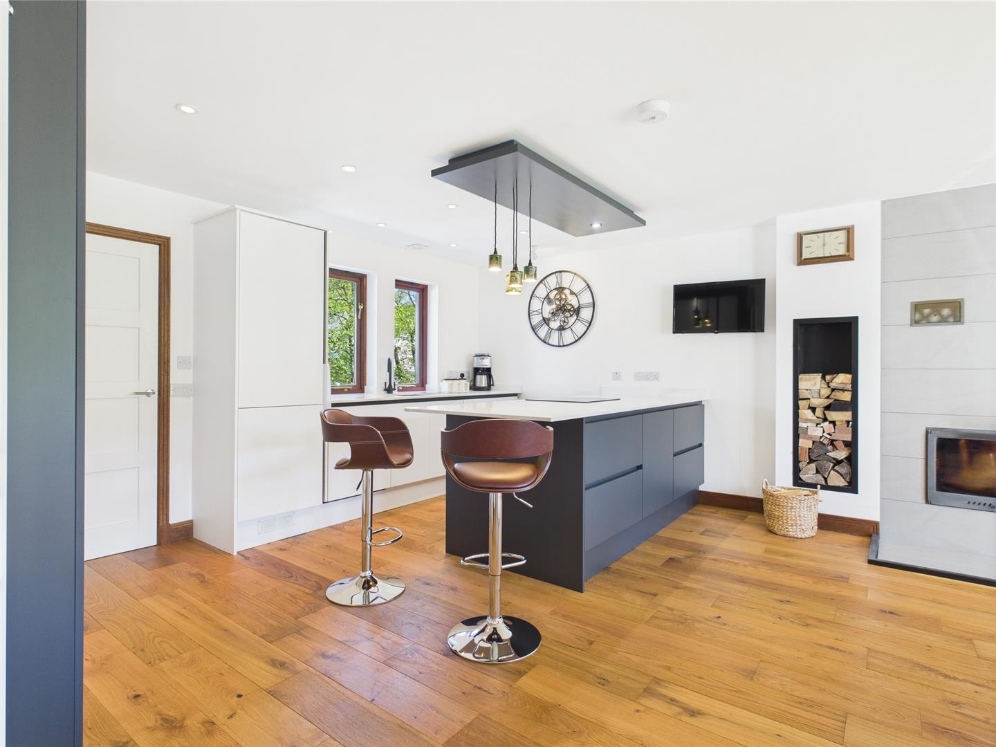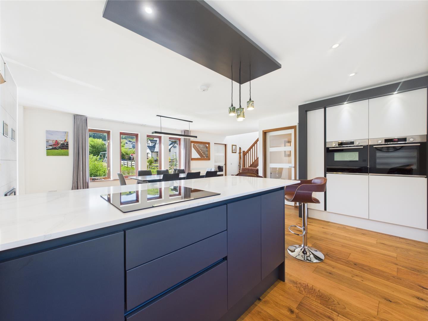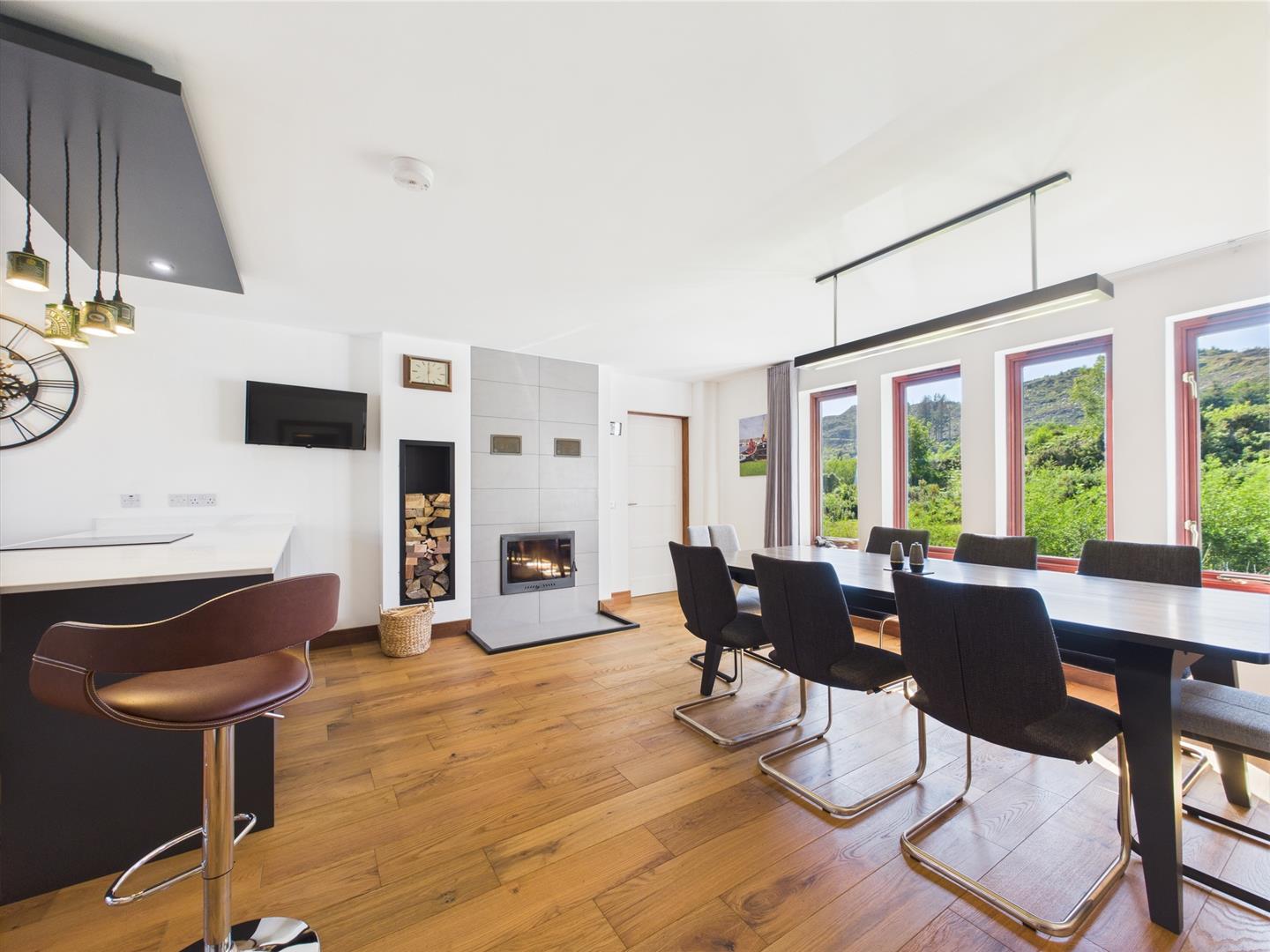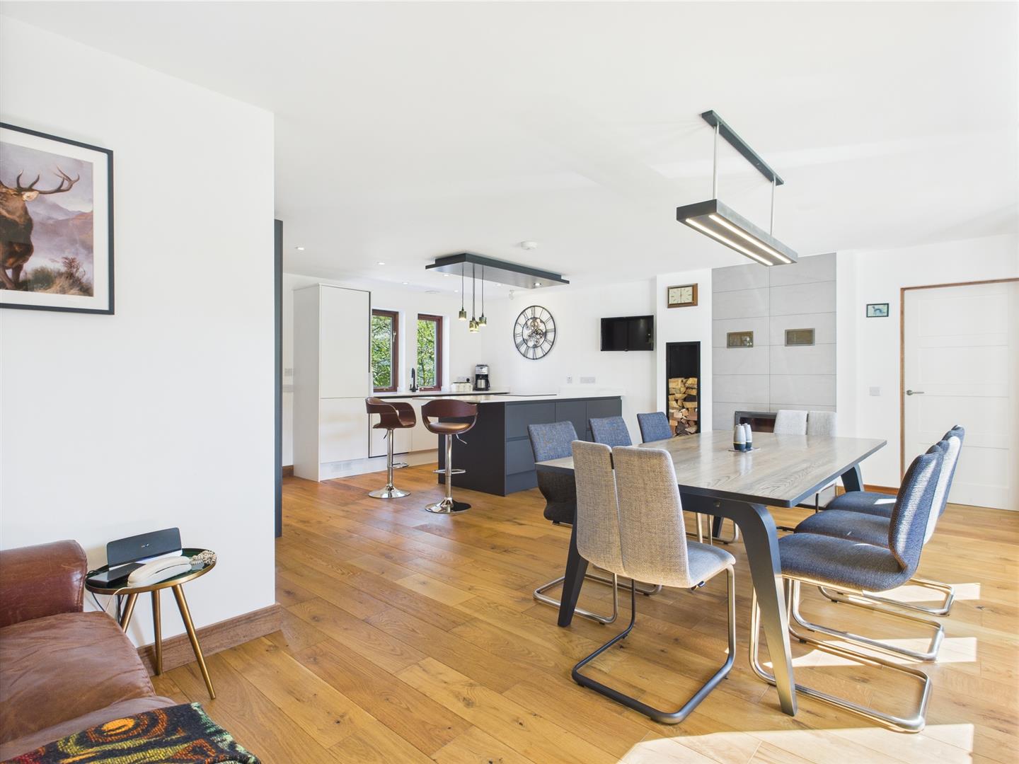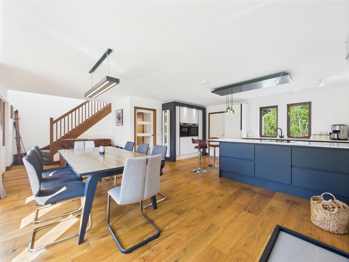 This well-designed kitchen/diner (6.54 x 5.06 m) features dark cabinetry, a central island with seating, and generous worktops. The dining area fits a table for eight, with natural light and garden views enhancing its warm, open feel—ideal for everyday living and entertaining.