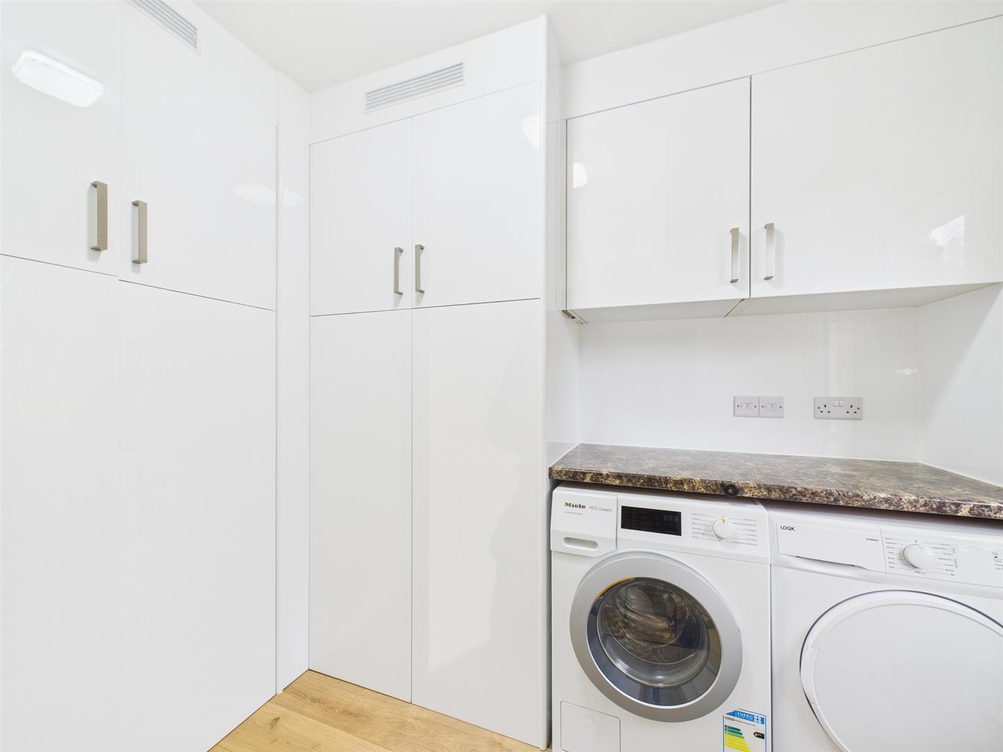 The utility room is plumbed for a washing machine and includes a selection of gloss white storage units. Door to rear garden.
